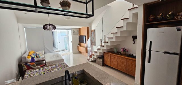 Casa duplex no Centro de Búzios, a menos de 100mts da Praia de Manguinhos, condomínio fechado, com piscina, sauna, quadra de tênis e sala de jogos vaga de carro, pra todos as unidades. 1° piso: Sala, cozinha planejada americana, banheiro social, 1 suíte, área externa e lavanderia; 2° piso: suíte com vista para todo o jardim do condomínio. Obs : O imóvel será vendido com porteira fechada.