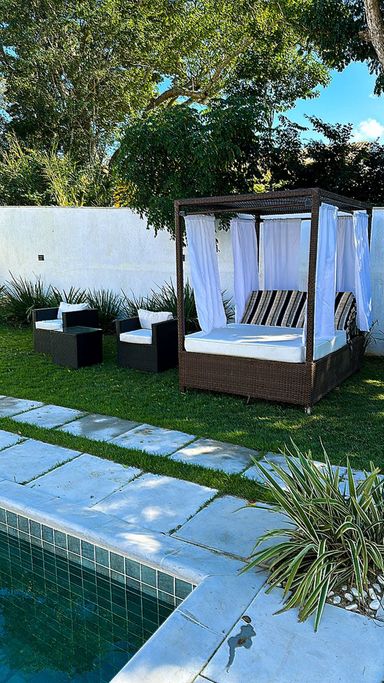 A casa possui piscina privativa, área VIP com banheiro externo, espaço gourmet com fogão a lenha, churrasqueira, adega para vinhos, freezer cervejeira e sistema de som JBL integrado. Há também um charmoso gazebo com voal, ideal para relaxar.